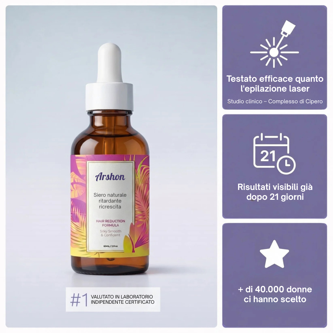 Cosa fa Arshon : Rallentando la ricrescita, distanzi le sedute → La tua pelle ha finalmente il tempo di rigenerarsi tra due depilazioni → I brufoli e peli incarniti scompaiono naturalmente.